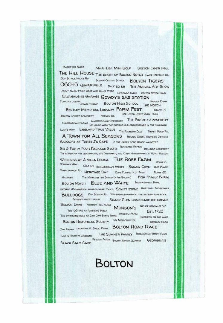 Introducing the ultimate Bolton companion – this cotton tea towel is a trove of local trivia, folklore, and nostalgia! Dive into the history of Bolton while wiping away spills with style. Choose your color with blue, red, or green stripes, and hang it proudly with the corner loop. This towel is so fabulous, even the washing machine wants to be friends! Approximate size: 16 x 26. Designed and printed in CT by a small (but mighty!) woman-owned business.