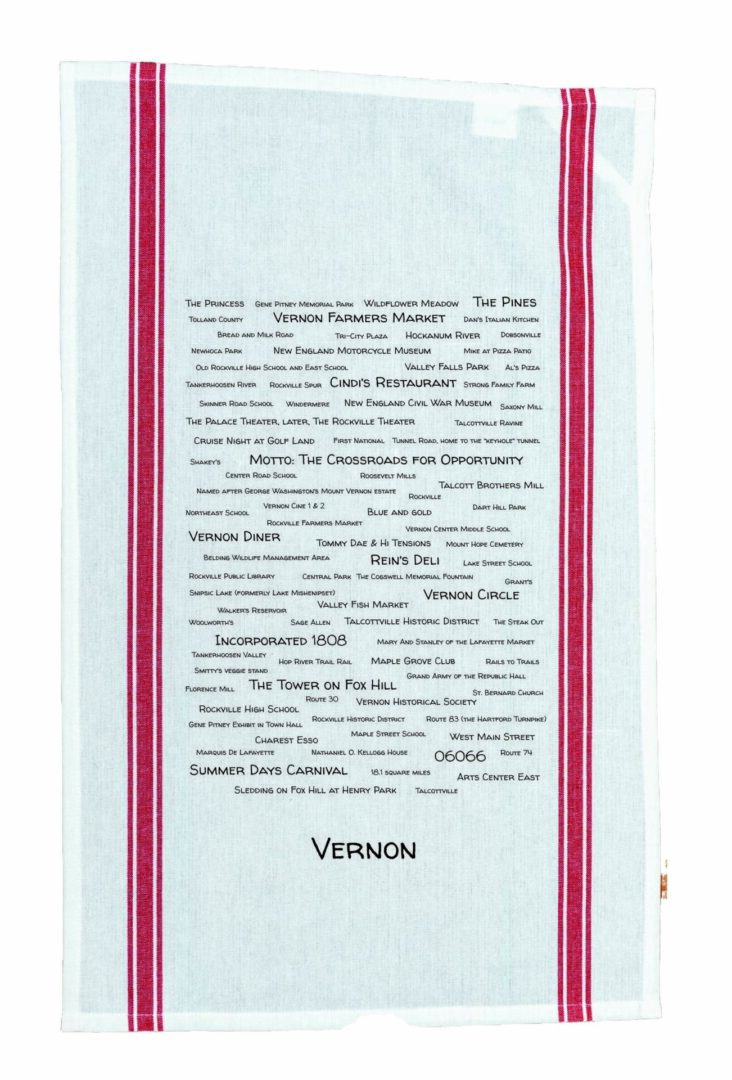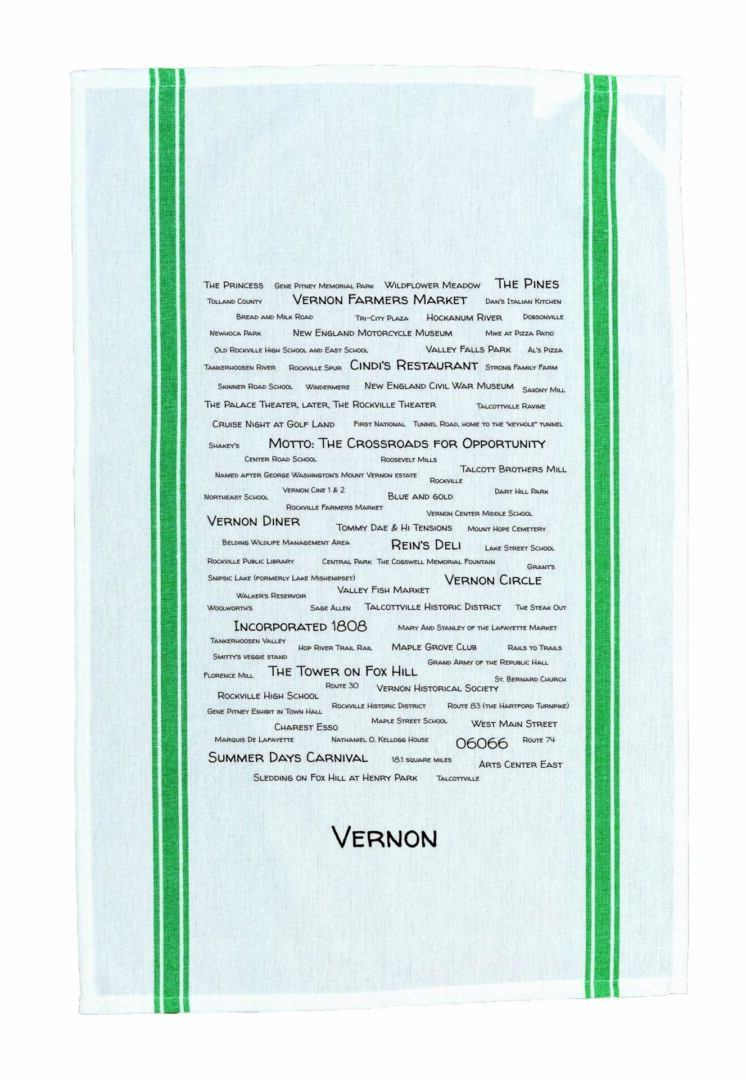 Introducing the ultimate Vernon companion – this cotton tea towel is a trove of local trivia, folklore, and nostalgia! Dive into the history of Vernon while wiping away spills with style. Choose your color with blue, red, or green stripes, and hang it proudly with the corner loop. This towel is so fabulous, even the washing machine wants to be friends! Approximate size: 16 x 26. Designed and printed in CT by a small (but mighty!) woman-owned business.